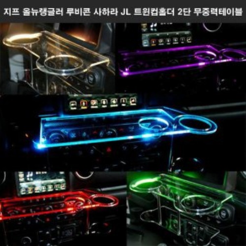 지프 올뉴랭글러 루비콘 사하라 JL 트윈컵홀더 2단 무중력테이블 USB 5V LED 차량용 식탁 선반 트레이 핸드폰 스마...